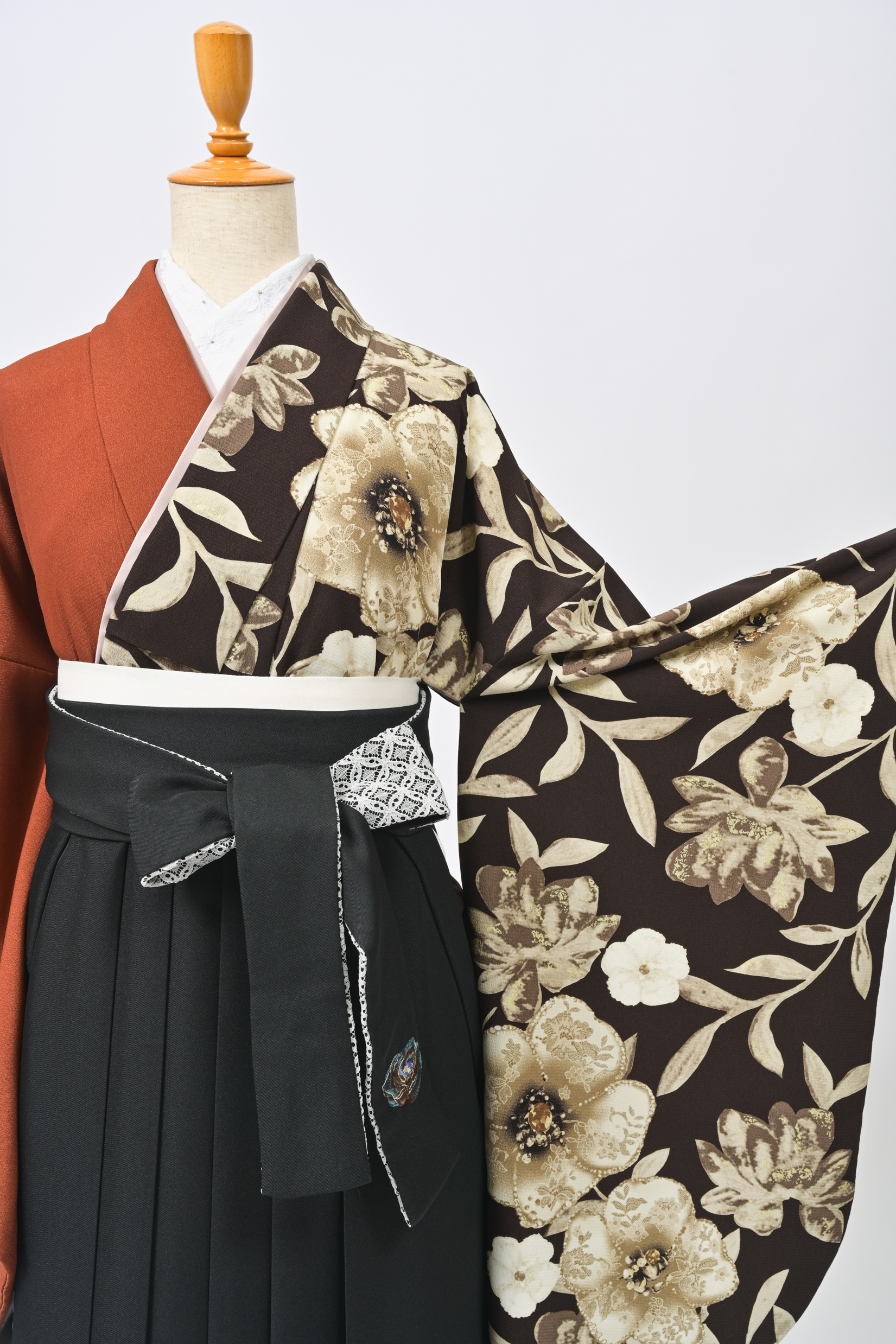 3. 紅一点・レース花/片身替り・焦げ茶×テラコッタ